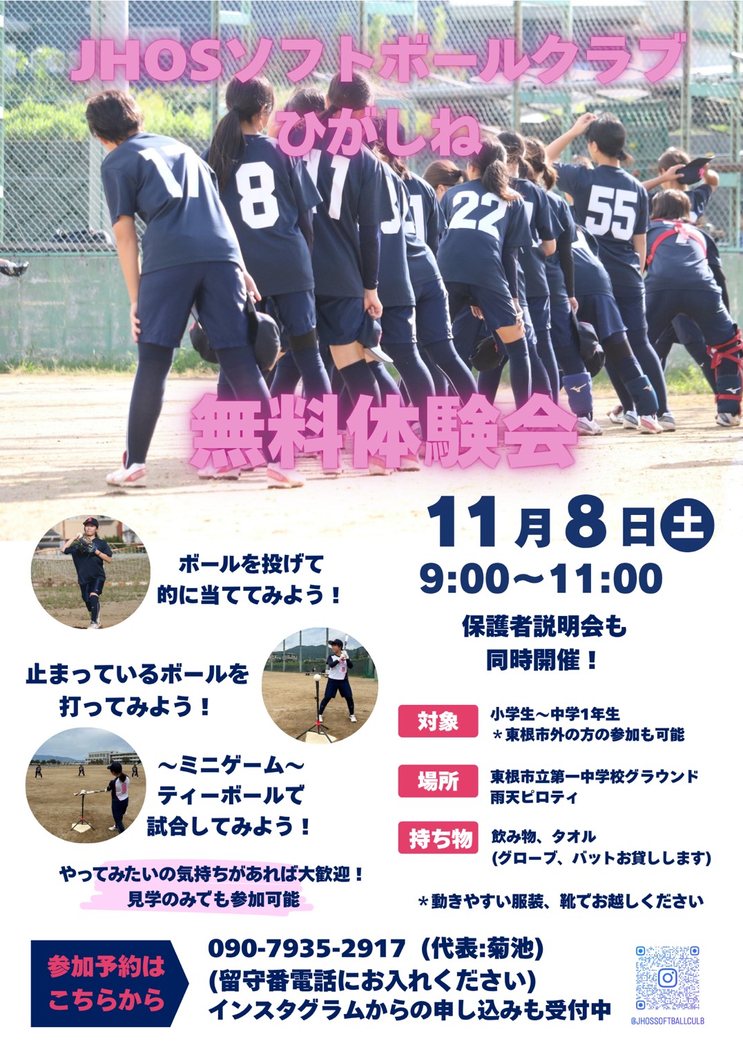R7.11     JHOSソフトボールクラブひがしね(ソフトボール)の体験活動実施案内パンフを掲載いたしました。